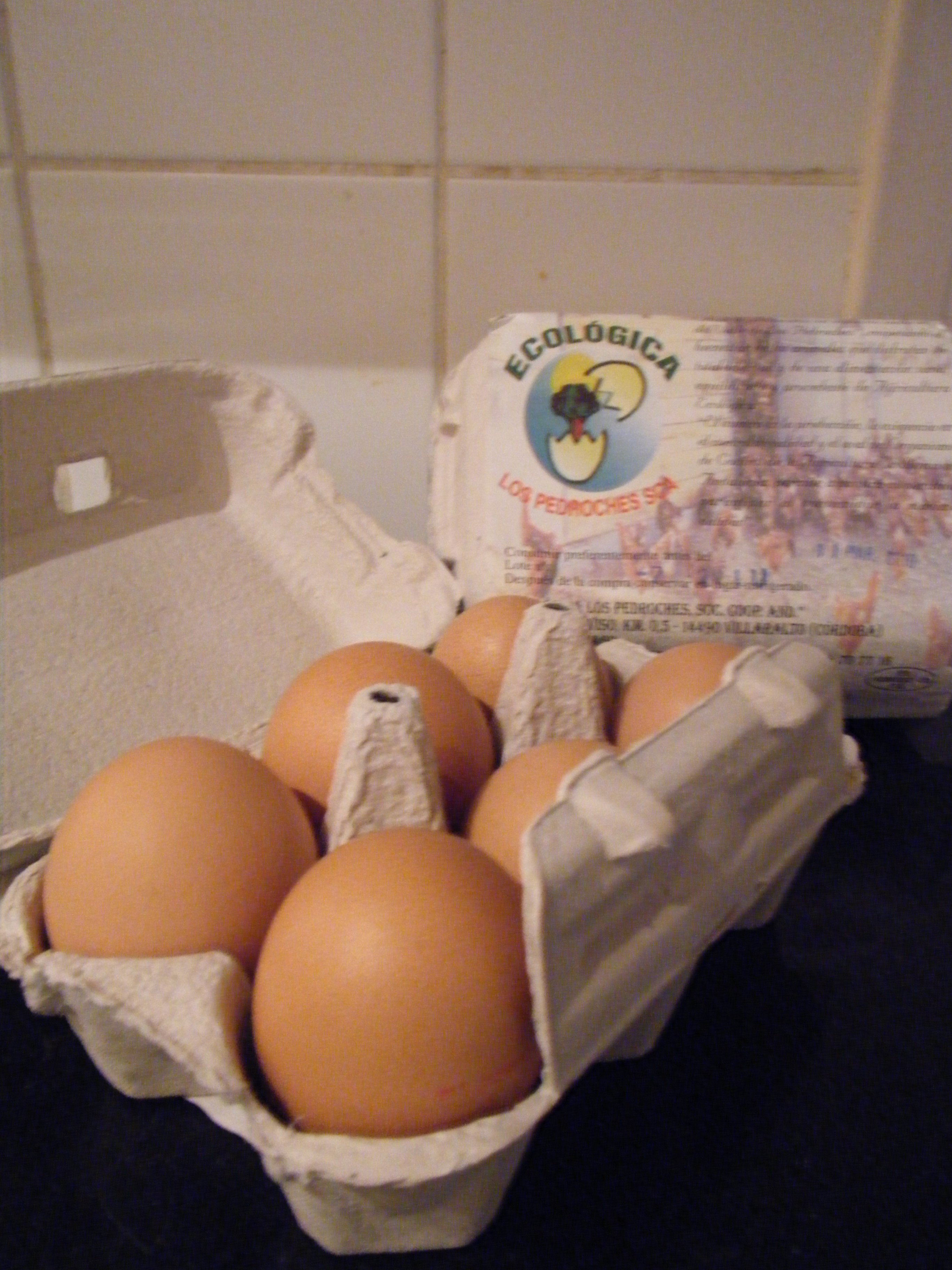 When I was little, growing up in the country, we were fortunate to be able to buy our eggs directly from relatives who had a small farm with a few free-range happy chickens running around in the yard. (I also got fleas from playing in the hen-house, but that’s another tale to be told another time). As an adult I’ve always tried to purchase free-range eggs but I admit to occasionally letting my standards slip when it’s a choice between battery eggs or no eggs at all. Here in Barcelona it can be tricky – there still aren’t many free-range producers (In 2008 97% of Spanish eggs were from battery hens, vs 1.2% barn-raised and 1.8% free range. Compare this to 58.3% / 3.8% / 37.9% respectively in the UK)* and only a few of the bigger supermarkets seem to stock free-range.