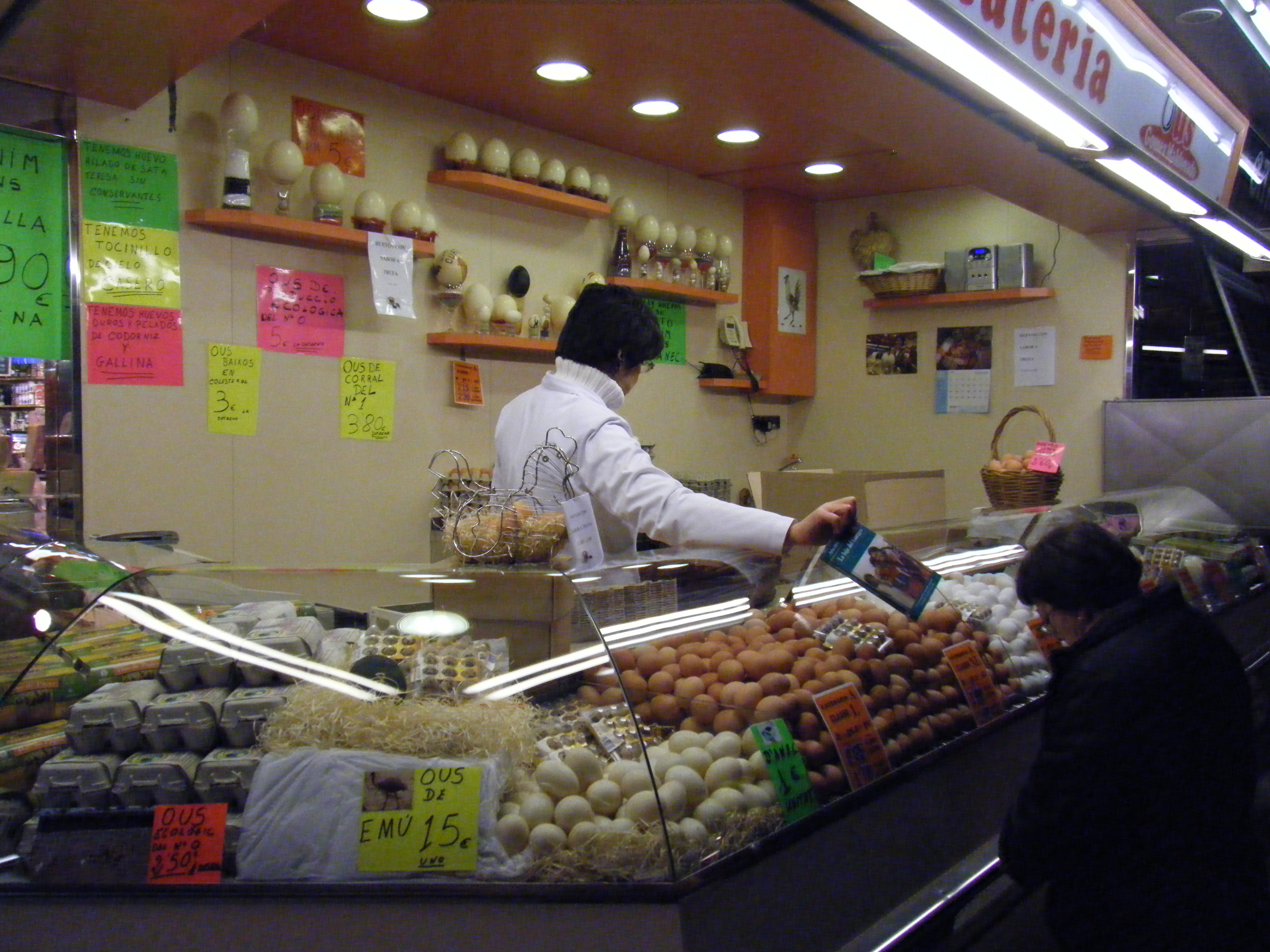 The very nice lady at the egg stall (hueveria Gomez-Maldonado, Stall number 19 in the Santa Caterina Market, only open mornings) explained that it’s a tricky situation for retailers: to buy free-range eggs from providers is more expensive than buying battery, and because the demand is low from customers they can’t justify buying in bulk to get a discount. As they buy at a high price they subsequently have to retail them at a high price, which keeps the demand low. There just doesn’t seem to have been the same awareness/campaigning here to persuade people to *ask* for free-range or to pay that bit extra.