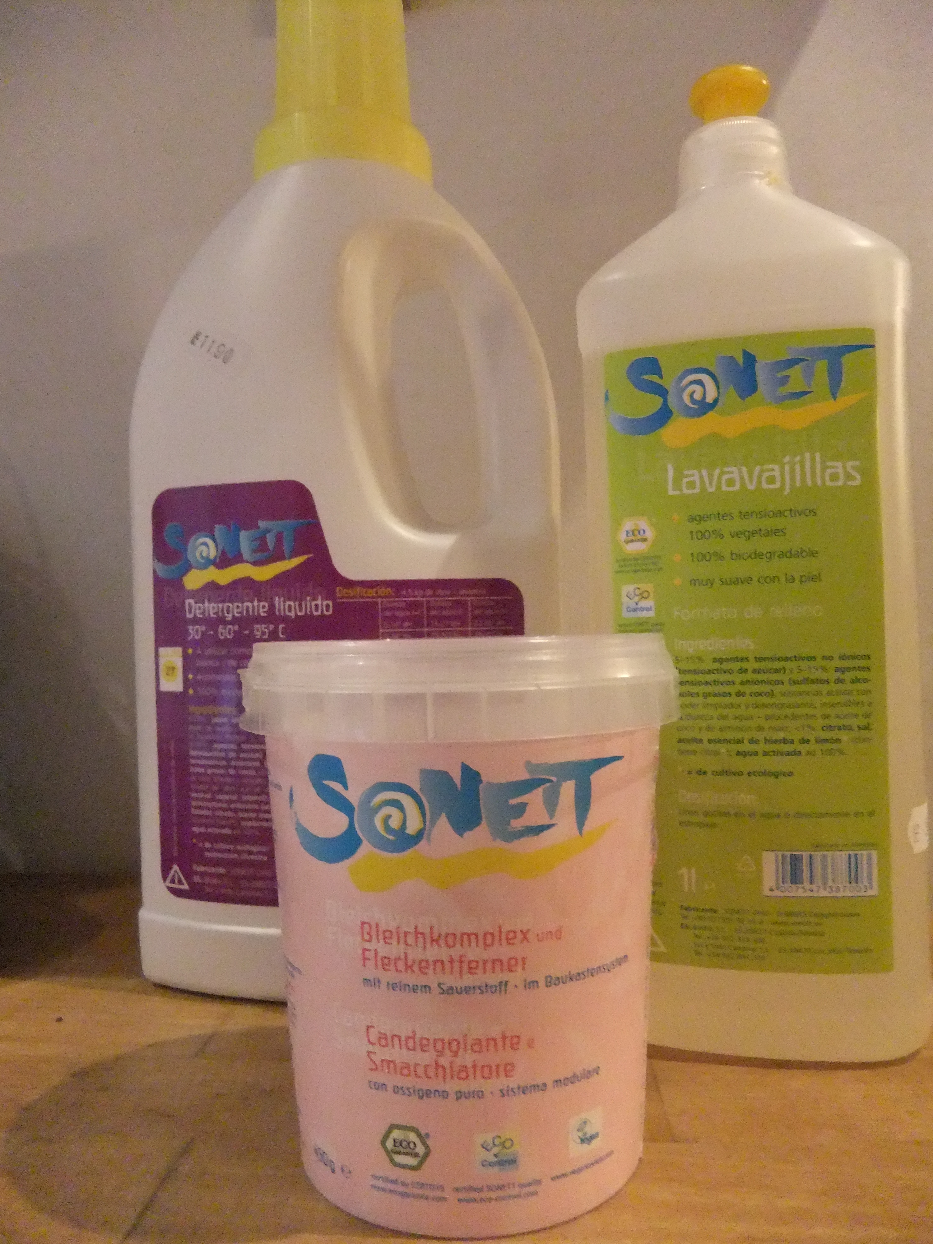 Sonett laundry detergent on it’s own has worked for me so far on mixed, lightly soiled laundry. It is runny not gloopy, so be careful when pouring. It has a faint herby smell…rosemary or lavender or something; they also do an entire ‘neutral’, scent-free range which I intend to try out on Dr DTS. I’m also planning to experiment with the whitening agents later this week, on some of my white clothes that are distinctly yellow-stained through a mixture of dirt, suncream and sweat. Gotta love those Barcelona summers!