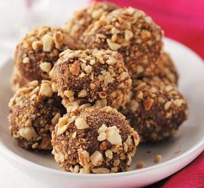 Sprinkle the very finely chopped toasted almond flakes on a flat plate, take half a teaspoonful of the third batch of truffle mixture and roll it round in the nuts, pressing them to form an outer coating.